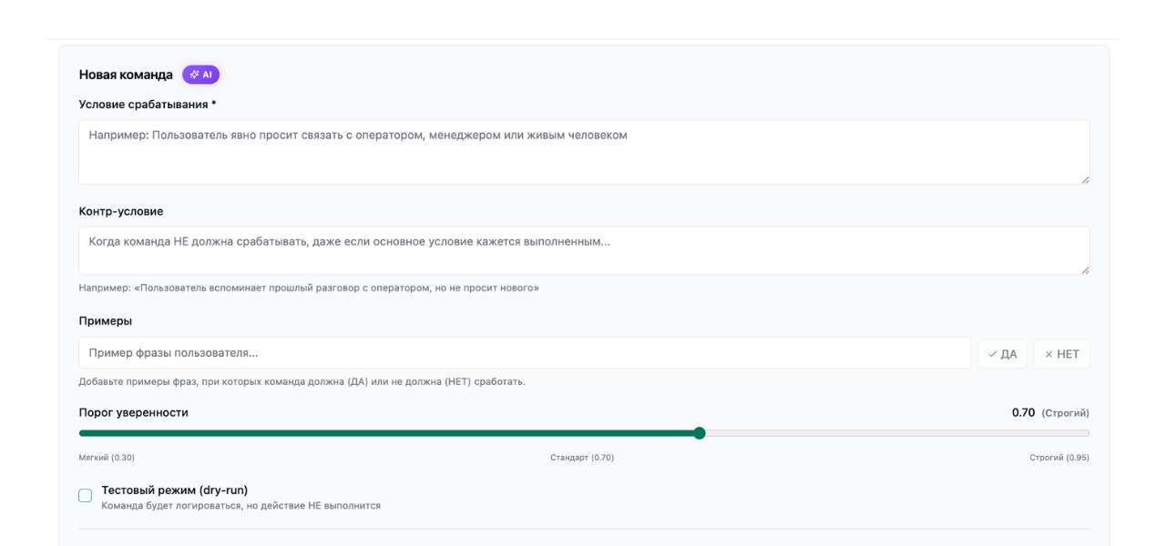 - Мягкий (0.30): Команда будет срабатывать часто, даже на намёки (выше риск ложных срабатываний).