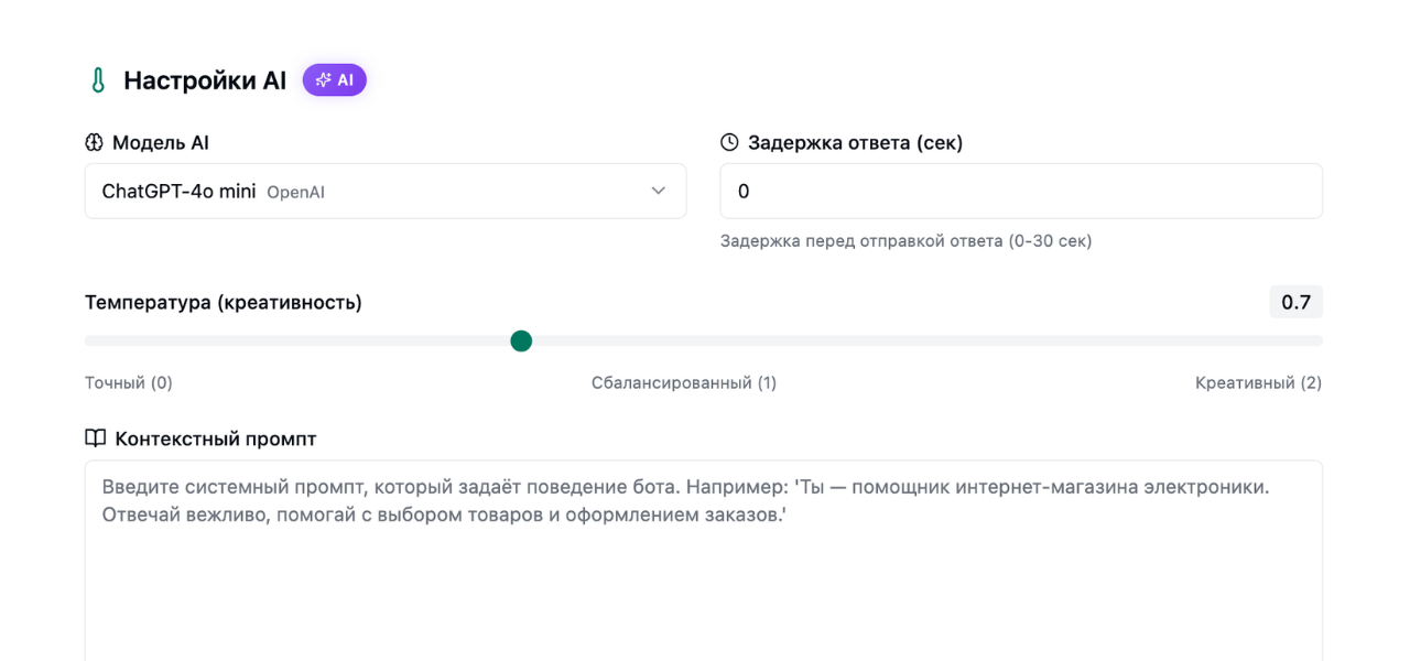 *Во многих разделах настройки ИИ-агентов появилась кнопка AI - воспользуйтесь ей для ускорения настройки бота. Ответьте на несколько вопросов ИИ, и он сам заполнит большинство разделов.