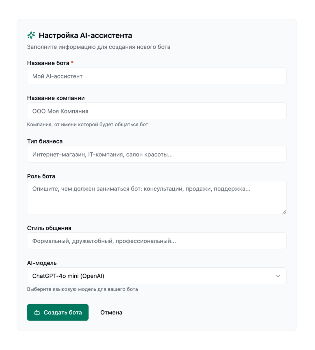 Укажите официальное название или бренд компании. Бот будет представляться от имени этой компании, чтобы клиенты понимали, с кем они разговаривают.