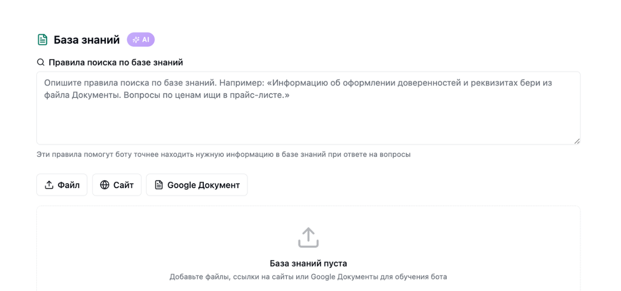 Опишите его функционал. Четко пропишите, какие задачи он решает: помогает выбирать товары, записывает на услуги, отвечает на технические вопросы или оформляет возвраты. Чем точнее описание, тем релевантнее будут ответы.